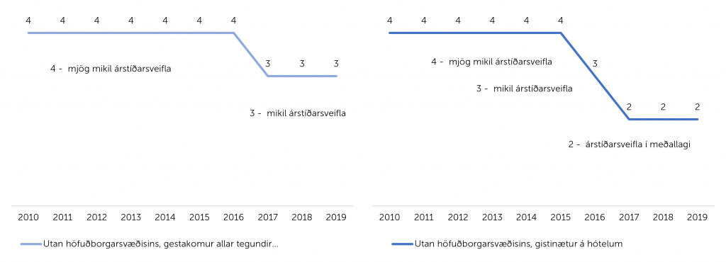 Á Akureyri er árstíðasveiflan mjög mikil fram til 2017 en er skilgreind sem mikil eftir það. Rétt er að hafa í huga að mælikvarðinn grípur ekki áhrif af erlendum ferðamönnum með skemmtiferðaskipum né áhrif af dagsferðamönnum/gegnumstreymisumferð um bæinn. Á Austurlandi er árstíðasveiflan í gestakomum í allri tegund gistingar mjög mikil á tímabilinu 2010-2019. Mikil árstíðasveifla dregur úr stöðugleika og eykur óhagkvæma nýtingu á fastafjármunum og vinnuafli. Hætta er á að hagnaður sumarsins fari í að reka fyrirtækin yfir vetrarmánuðina. Mikil árstíðasveifla dregur úr vilja til uppbyggingar og takmarkar möguleika á sjálfbærum rekstri. Þar er því verk að vinna.