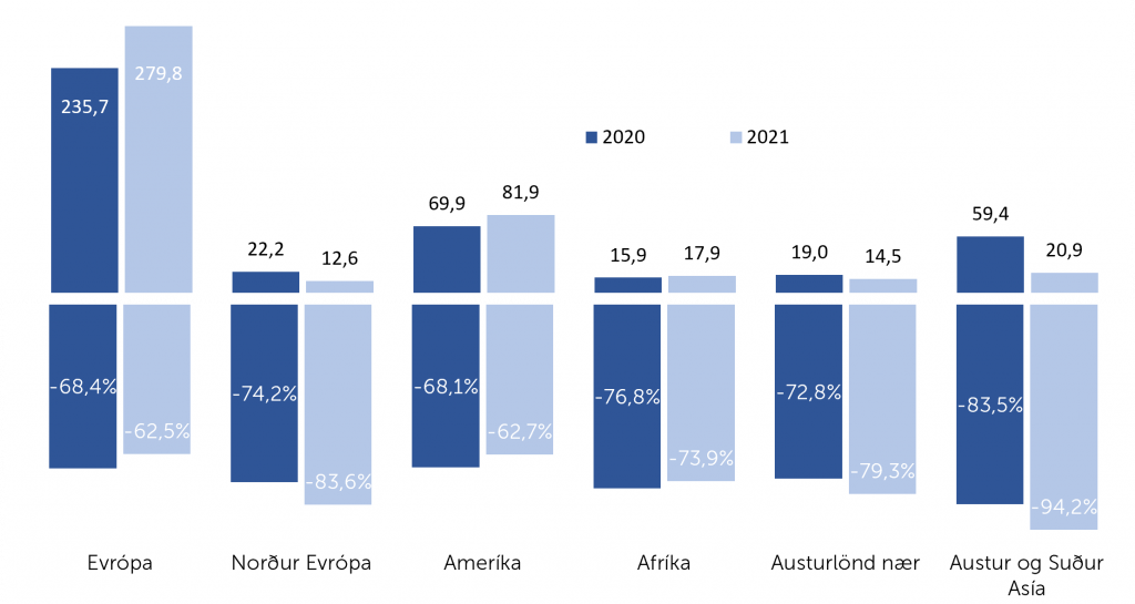 Evrópa, vinsælasti heimshlutinn, er að taka við sér. Í byrjun árs 2021 hertu nokkur lönd aðgerðir á landamærum en þegar leið á árið var víða slakað á takmörkunum og í nóvember 2021 voru einungis um 3% áfangastaða algjörlega lokuð fyrir erlendum ferðamönnum. Í mörgum löndum heims hefur sterkur innlendur markaður í farþegaflugi og ferðaþjónustu skipt sköpum fyrir afdrif fyrirtækja í greininni. Árið 2019 heimsóttu um 84 milljónir erlendra ferðamanna lönd í Norður-Evrópu, á árinu 2020 voru þeir rúmlega 22 milljónir og á síðasta ári 12,6 milljónir eða 83,6% færri en 2019.