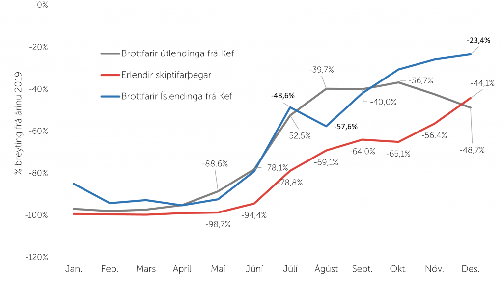 Farþegaflug um heiminn endurspeglast nokkuð vel í fækkun alþjóðlegra ferðamanna. Hér á landi tók alþjóðlegt farþegaflug við sér á ný á árinu 2021 en farþegafjöldinn er langt undir því sem hann var fyrir faraldur. Eftir stöðugan vöxt undanfarin ár fækkar farþegum um Keflavíkurflugvöll annað árið í röð. Í fyrra var hann svipaður og hann var á árinu 2010. Í fyrra fóru svipað margir erlendir ferðamenn frá landinu um völlinn og Íslendingar gerðu 2018.