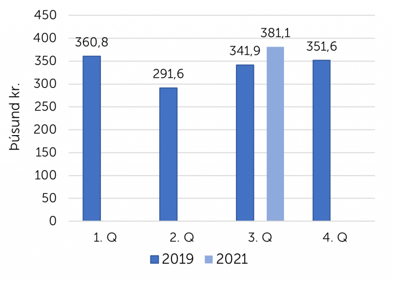 Á tímabilinu 2013-2019 voru meðalútgjöld erlendra ferðamanna án flugmiða með íslenskum flugrekendum 175 þúsund kr. á föstu verðlagi ársins 2020. Á 3. ársfjórðungi í fyrra voru þau um 226 þúsund krónur, eða 24% hærri en á sama fjórðungi 2019 en þá voru þau um 183 þúsund krónur.