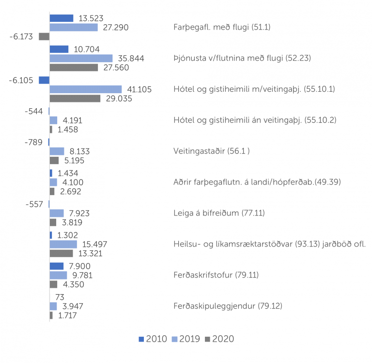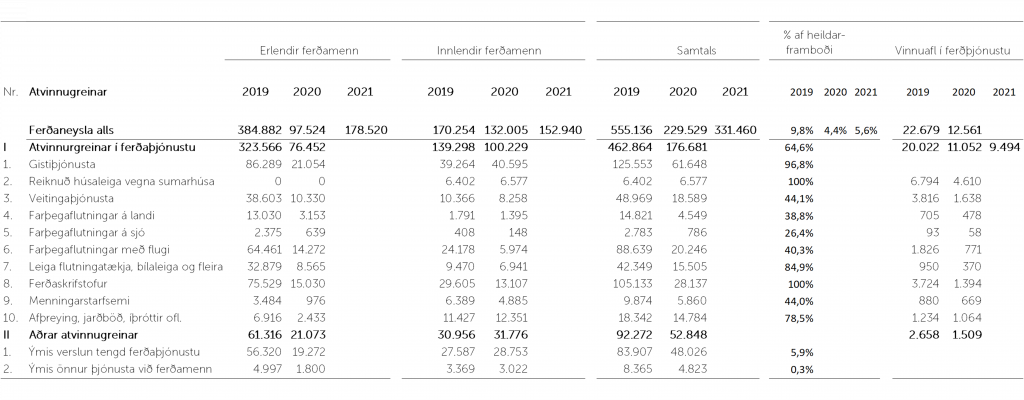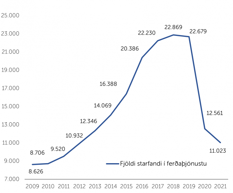 Á árinu 2020 fækkaði vinnuafli í ferðaþjónustu um tæplega 12.600 manns. Það er í nokkuð góðu samræmi við þá sem voru atvinnulausir í lok mars 2021 en þá voru yfir 10.500 manns atvinnulausir eða á hlutabótum sem höfðu starfað í ferðaþjónustu. Hlutabótaleiðin gilti frá 15. mars 2020 til 31. maí 2021. Í árslok 2021 má gera ráð fyrir að fjöldi starfandi í ferðaþjónustu hafi verið rösklega 11 þúsund.