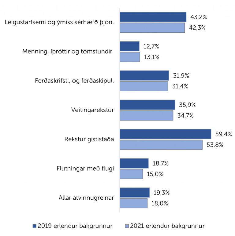Á umliðnum árum hefur hlutfall starfandi í ferðaþjónustu með erlendan bakgrunn aukist verulega sem skipti sköpum fyrir vöxt greinarinnar. Á árinu 2014 var erlent vinnuafl um 19% af vinnuafli í helstu greinum ferðaþjónustunnar, 2019 var það 37%. Í fyrra var hlutfallið tæplega 34%. Samkvæmt Vinnumálastofnun stendur þessi hópur verr að vígi þegar tekur að kólna í hagkerfinu og margir fara aftur til baka til síns heimalands.