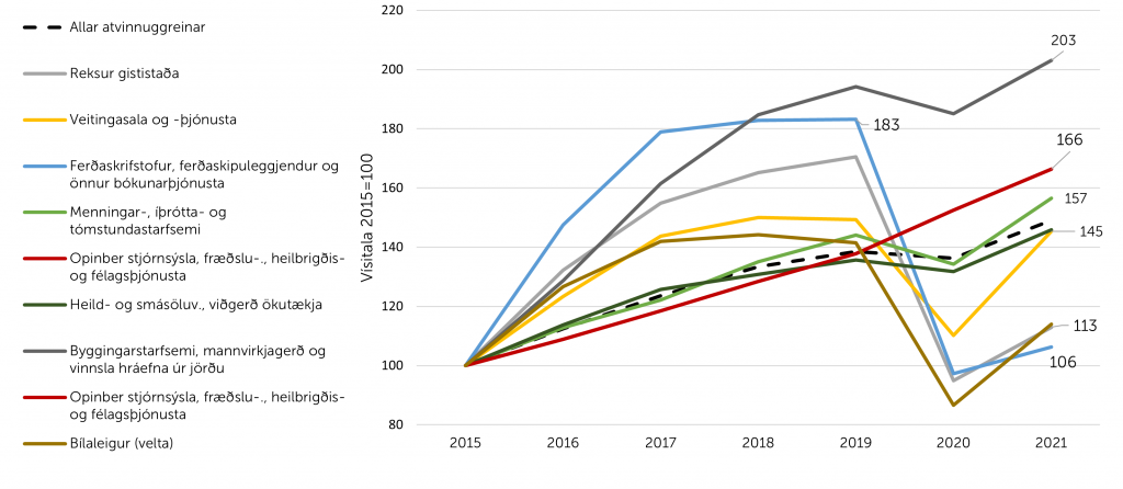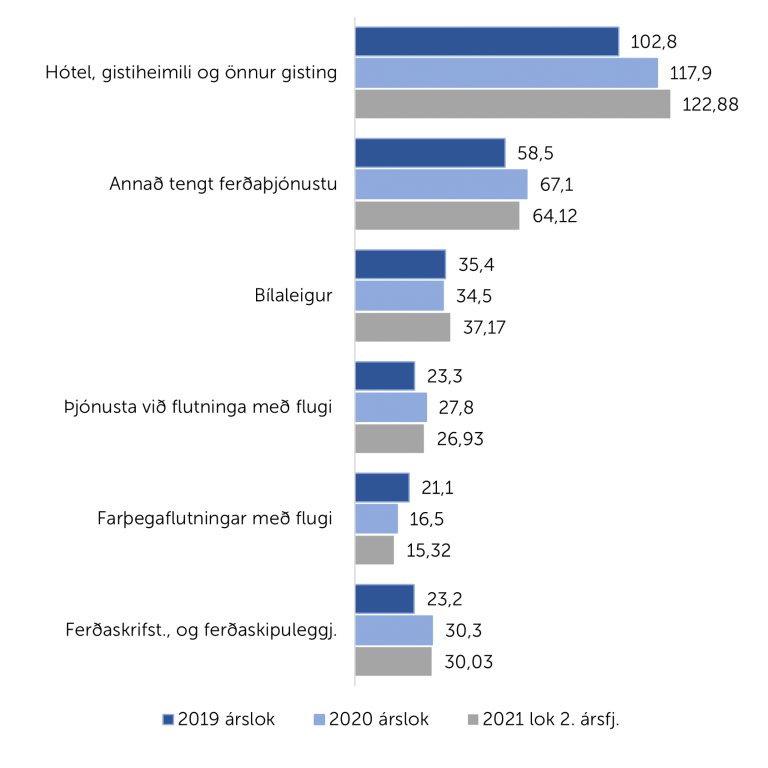 Ferðaskrifstofur, ferðaskipuleggjendur og bókunarþjónusta er sú atvinnugrein sem að öllu leyti þjónustar ferðamenn. Það gildir líka að mestu um gistiþjónustu. Hægt er að lesa úr töflunni hér að ofan að þær ferðaskrifstofur sem eru í innflutningi (outbound) hafa tekið mun betur við sér en þær sem sinna erlendum ferðamönnum (inbound). Þannig voru útfjöld innlendra ferðamanna um 13 milljarðar kr. í fyrra en voru rúmlega 15 milljarðar kr. 2019. Leiða má líkum að því að stærsti hluti útgjaldanna sé til kominn vegna þjónustu við Íslendinga á leið til annarra landa.