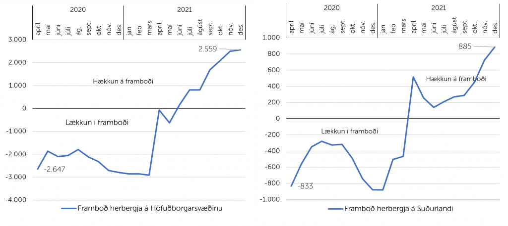 Framboð herbergja á landinu öllu var orðið meira í árslok 2021 en það var í árslok 2019. Framboð herbergja á höfuðborgarsvæðinu var 5.399 í desember 2019 en í árslok 2021 var framboðið komið í 5.167 herbergi sem gefur tilefni til bjartsýni eftir dapurlega þróun undanfarin tvö ár.