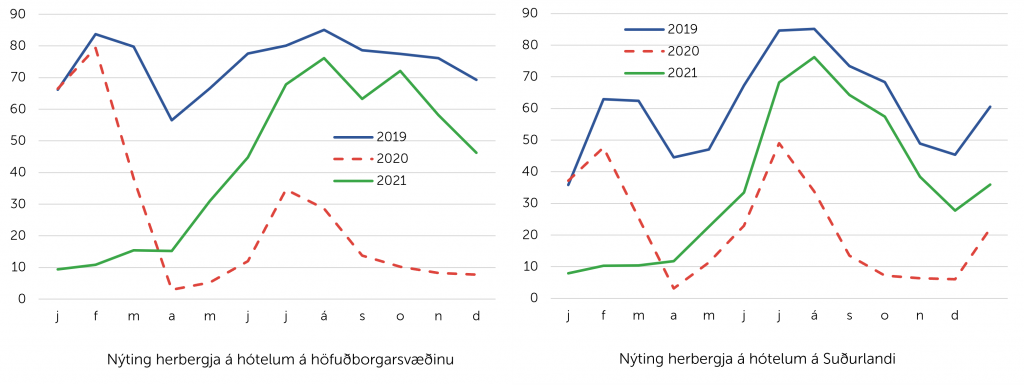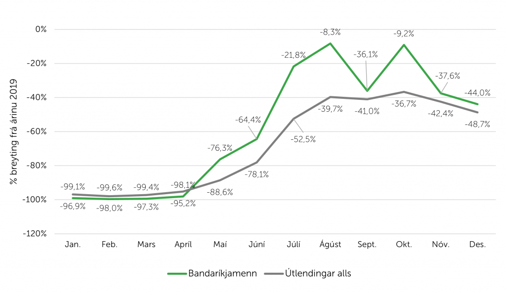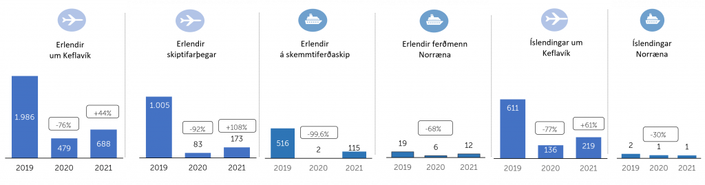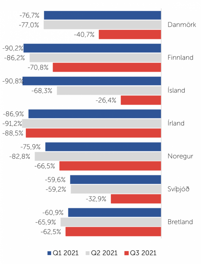 Í Norður-Evrópu fækkar erlendum ferðamönnum annað árið í röð. Aðeins á Íslandi og í Svíþjóð fjölgar ferðamönnum á árinu 2021 borið saman við 2020. Enn er þó langt í land að staðan hérlendis sé eins og fyrir faraldur þótt hún sé betri en annars staðar í Norður-Evrópu. Hingað til lands komu um 700 þúsund erlendir ferðamenn, eða 44% fleiri en 2020, en 65% færri en 2019. Til Svíþjóðar fóru um 2,5 milljónir erlendra ferðamanna, eða 34% fleiri en 2020, en 67% færri en 2019. Örari fjölgun ferðamanna hingað til lands má rekja til þess að í júlí 2021 var ákveðið að hleypa bólusettum erlendum ferðamönnum til landsins án þess að skima fyrir COVID-19. Þrátt fyrir að Ísland væri á rauðum lista hjá Sóttvarnastofnun Evrópu fjölgaði erlendum ferðamönnum nokkuð hratt þegar líða tók á árið, aðallega bandarískum ferðamönnum.