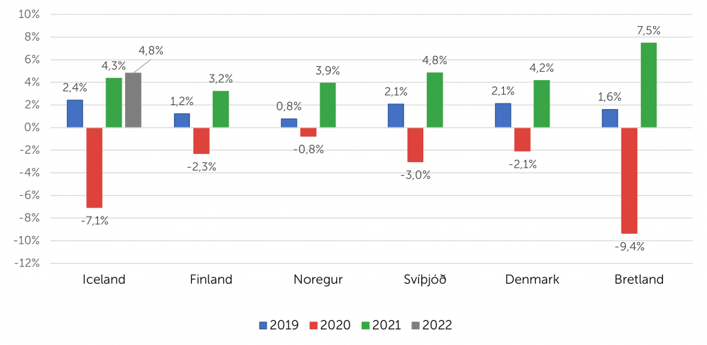 Á myndinni hér að ofan kemur fram að samdráttur í hagkerfinu var mun meiri hér 2020 en víðast hvar annars staðar í Norður-Evrópu fyrir utan Bretland, þar var hann 9,4%. Fjárlög fyrir árið 2022 voru afgreidd með halla sem nemur 6,3% af landsframleiðslu en hlutfallið var yfir 8% árin 2020 og 2021. Áætlanir gera þannig ráð fyrir að það dragi úr hallanum, m.a. vegna aukinna efnahagsumsvifa og minnkandi mótvægisaðgerða stjórnvalda vegna farsóttarinnar.