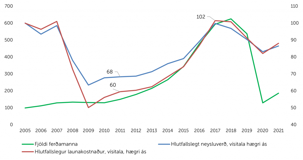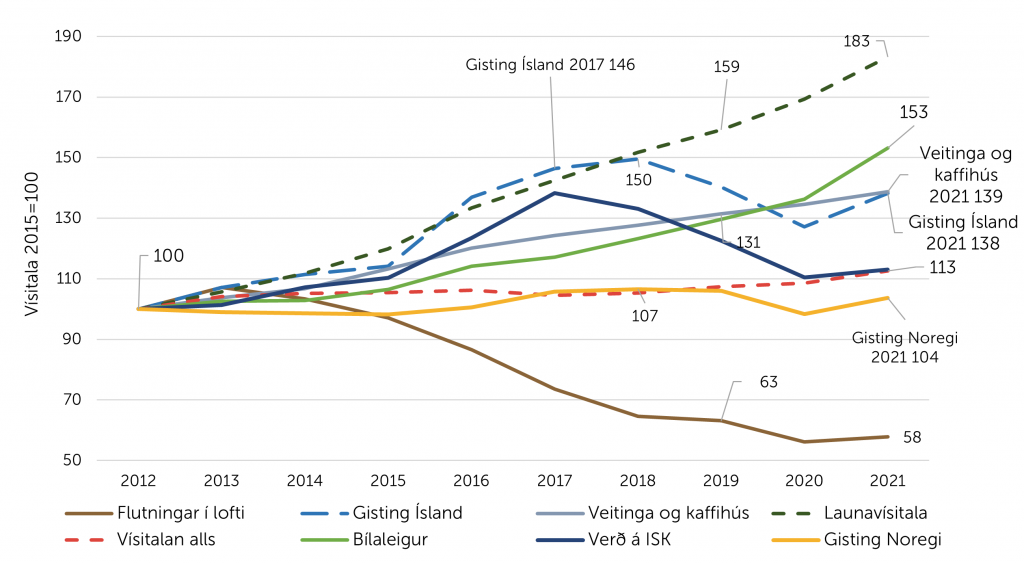 Eftirspurn erlendra ferðamanna var gríðarlega mikil fram til ársins 2019. Myndin hér að ofan segir söguna í tölum og dregur fram mismunandi þróun í verðlagi á ferðaþjónustuvörum borið saman við verð á ISK samkvæmt gengisvísitölu og þróun launavísitölunnar. Myndin sýnir að verð á gistingu í Noregi hækkar á tímabilinu 2012–2018 um 7% en á Íslandi um 50%. Verð á gistingu hér á landi og launakostnaður samkvæmt vísitölu haldast í hendur fram til 2018 en þá skilur í sundur, verðlag á gistingu lækkar en launavísitalan heldur áfram að hækka.