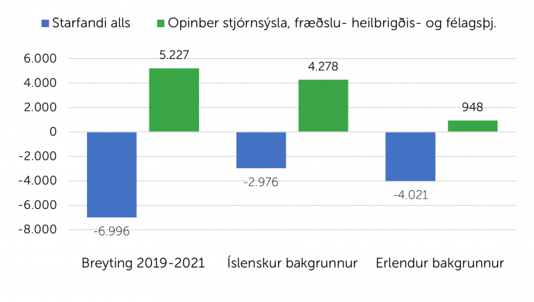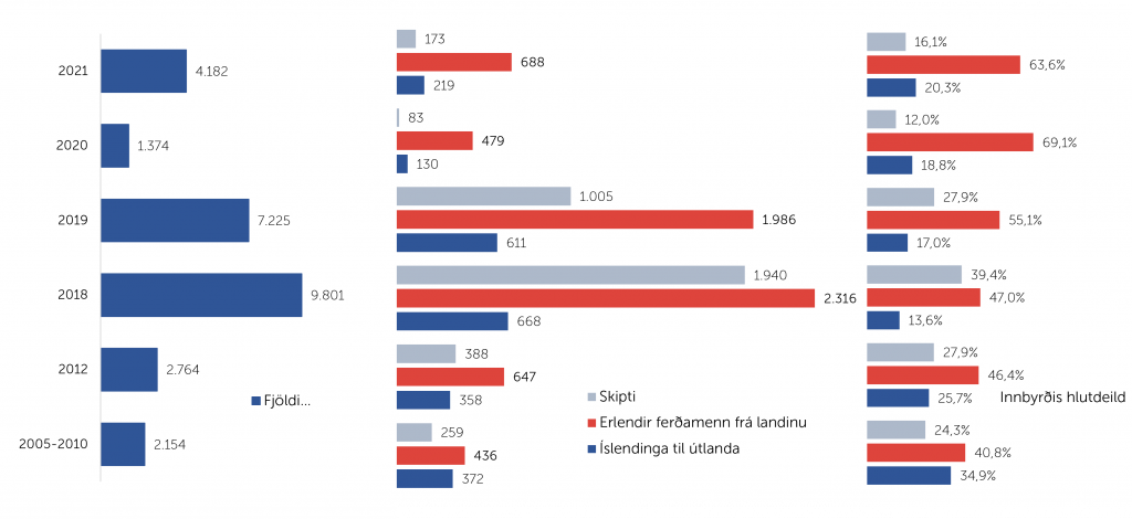 Mikil fækkun er meðal fjölda starfandi í ofangreindum greinum ferðaþjónustunnar milli áranna 2019 og 2021. Fækkunin er ekki síður hjá íslenskum starfsmönnum en þeim hefur fækkað um rúm 5 þúsund frá árinu 2019.