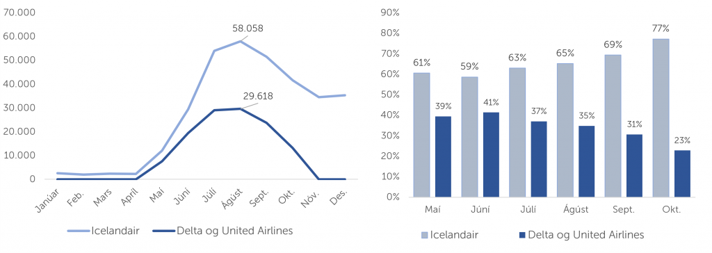 Framboð á flugsætum er oftast ágætisvísbending um eftirspurn. Í maí 2021 hóf bandaríska flugfélagið Delta að fljúga til landsins á ný og United Airlines í júní. Bandaríski markaðurinn hefur verið mikilvægt markaðssvæði Icelandair um langt árabil og nærtækt að álykta að öflug markaðssetning félagsins í mörgum borgum Bandaríkjanna hafi ýtt undir ferðavilja Bandaríkjamanna. Sterk miðlun í bandarískum fjölmiðlum frá gosinu í Fagradalsfjalli í Geldingadölum hafði jafnframt sitt að segja. Vegna framboðs stóru amerísku flugfélaganna jókst framboð sæta frá Bandaríkjunum hingað til lands að meðaltali um 48% á tímabilinu maí til október og má með sanni segja að það hafi ýtt undir viðspyrnuhraða áfangastaðarins.