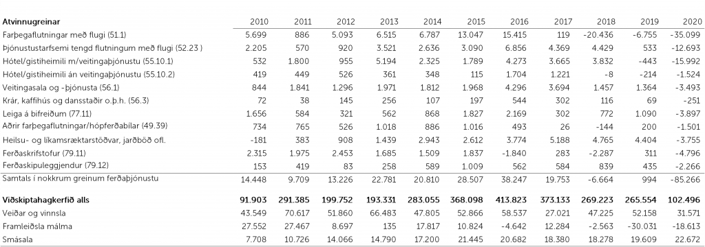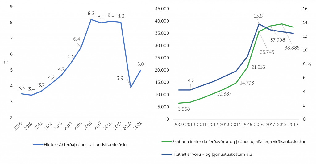 Árið 2020 lækkaði verðmætasköpun í ferðaþjónustu og tengdum greinum úr 8% af vinnsluvirði í 3,5% milli ára – í fyrra hækkaði hlutfallið úr 3,5% í 5%. Það staðfestir að í litlu hagkerfi þarf ekki marga erlenda gesti til að eftirspurnin hafi áhrif á atvinnu og verðmætasköpun í landinu. Til samanburðar var vægi fiskveiða, fiskeldis og fiskvinnslu 6,8%, fjármála- og vátryggingarstarfsemi 6,7%, fasteignaleigna og fasteignaviðskipta 12,4% og opinberrar stjórnsýslu 23% á árinu 2020.