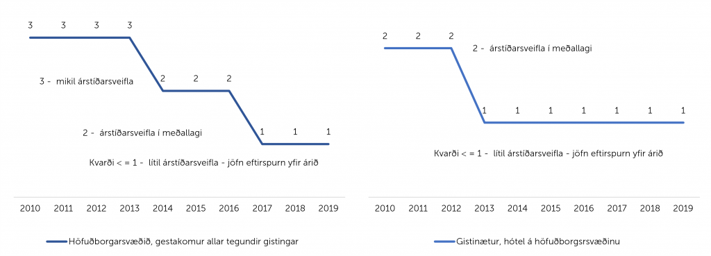 Lengi var mikil árstíðasveifla einn stærsti vandi íslenskrar ferðaþjónustu. Mikil árstíðasveifla í eftirspurn ferðamanna innan ársins eftir vöru og þjónustu dregur úr arðsemi og stöðugleika fyrir flesta hagaðila, fyrir rekstaraðila, fyrir þá sem sjá um markaðssetningu og vöruþróun, fyrir vinnuaflið og fjárfesta og eigendur innviða. Árstíðasveiflan er enn mikil utan höfuðborgarsvæðisins en samkvæmt mælistiku Alþjóðaferðamálastofnunarinnar er engin árstíðasveifla í eftirspurn erlendra ferðamanna eftir gistingu á hótelum á höfuðborgarsvæðinu frá árinu 2013. Mælikvarðinn byggir á hlutfalli þriggja fjölmennustu mánaða ársins i gestakomum og gistinóttum í heildarfjölda á heilu ári. Sömu aðferð er beitt yfir tekjur af erlendum ferðamönnum. Lítil árstíðasveifla í eftirspurn eftir gistingu á hótelum á höfuðborgarsvæðinu kemur ekki á óvart, nýtingin hefur verið gríðarlega góð, arðsemin líka sem hefur skilað sér í auknum fjárfestingum í gistirými.