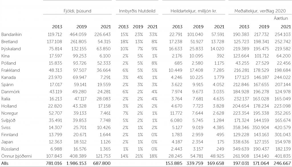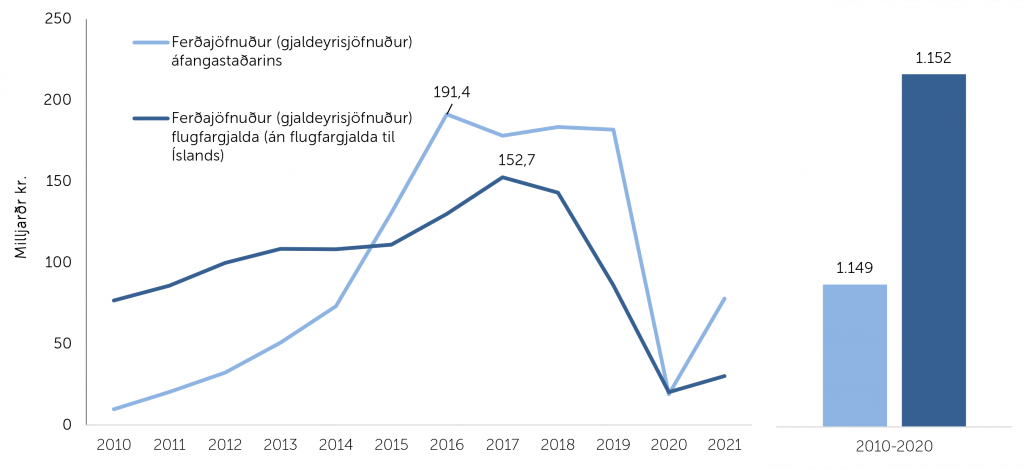 Í töflunni hér að neðan er gert ráð fyrir að útgjöld ferðamanna innanlands (án flugmiða til landsins) 2021 hafi verið 247 þúsund krónur en þar koma inn áhrif af háum tekjum á fyrstu mánuðum ársins sem óvarlegt er að búast við að haldi áfram í sama mæli. Engin óyggjandi skýring liggur fyrir á þessum háu tekjum en eitthvað var um fjarvinnu erlendra ríkisborgara hér á landi og að Íslendingar búsettir erlendis, með erlend kort, hafi komið heim um lengri og styttri tíma í faraldrinum. Jafnframt eru tilgátur um að efnaðir einstaklingar hafi haft meiri burði til að borga það sem til þurfti til að ferðast á öruggan hátt í heimsfaraldri.