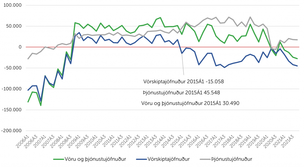 Um árabil hefur verið afgangur á vöru- og þjónustujöfnuði við útlönd og þar hafa þjónustutekjur, ekki síst útflutt ferðaþjónusta, skipt sköpum. Á 2. ársfjórðungi 2020 snerist þróunin við og nú er svo komið að uppsafnaður halli á vöru- og þjónustujöfnuði við útlönd 2021 og 2020 er um 88 milljarðar kr.